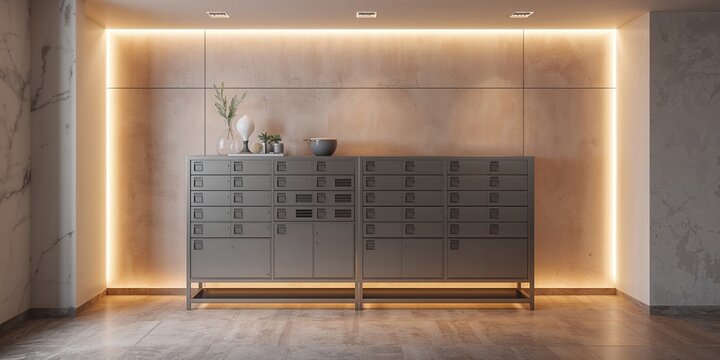 Locker mailboxes in a postal room illuminated by warm lighting, designed for efficient mail sorting and delivery, World Postal Day