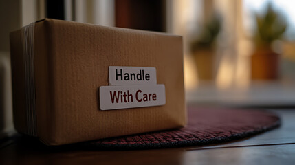 A cardboard box with a "Handle With Care" sticker rests on a wooden floor, conveying themes of fragile deliveries, careful packaging, and secure transport with blurred plants in the background.