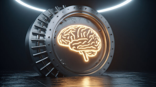 3D vault door with AI brain relief carving luminous outline security tech fusion illustration concept scene visual for commercial design use high detail quality stock image illustration concept scene