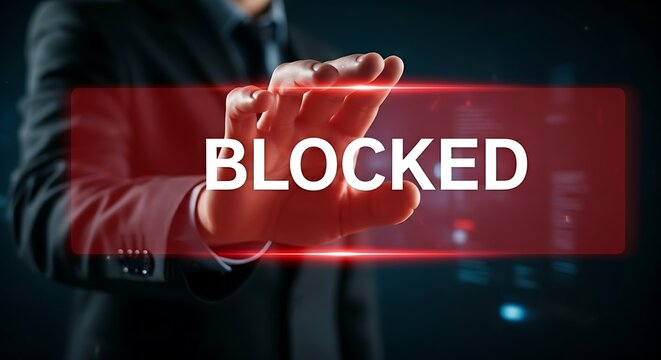 Data Loss Prevention (DLP) concept. A hand tries to drag a confidential document out of a secure network and is stopped by a red barrier with "BLOCKED" text.