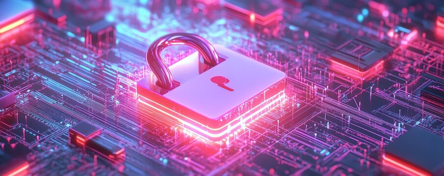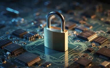 metallic padlock placed on a computer circuit board, glowing electronic circuits highlighting data protection
