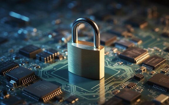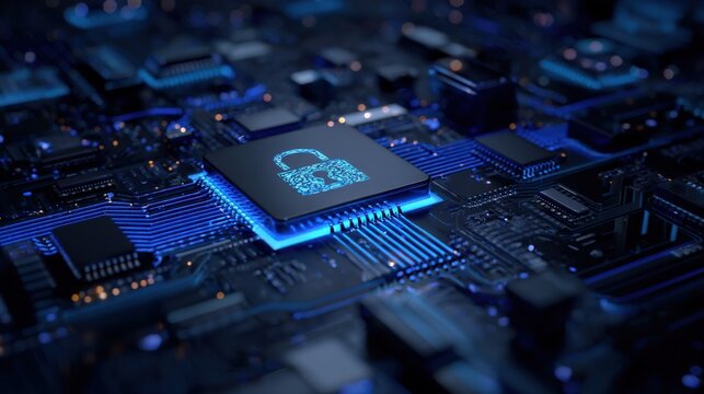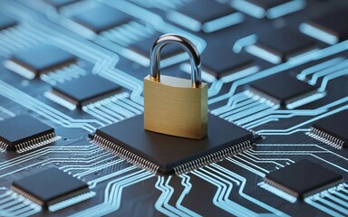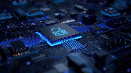 A glowing padlock icon on a microchip highlights digital security within an illuminated computer circuit board.