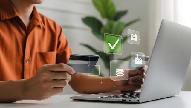 Person holding secure payment shield icon with green check mark