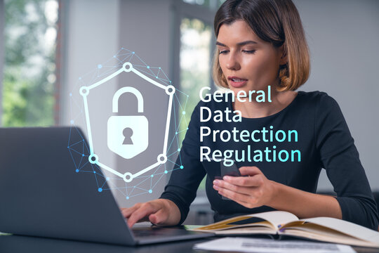 Smiling businessman talking holding using smartphone typing at office workplace with notebook. Concept of distant work, business education. GDPR Icon datum protection