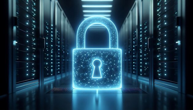 A glowing blue holographic padlock floats in the center of a dark server room. The padlock is closed and pulses with a soft light.