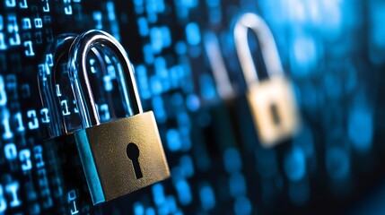 Gold padlock on blue digital code background representing data security and technology : Generative AI