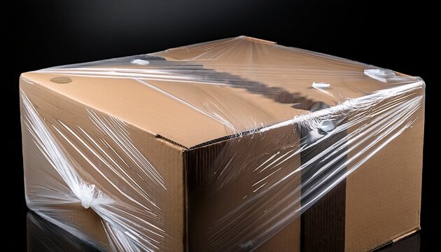 angled closeup of a cardboard box on a black background with fitted foam inserts wrapped in plastic for secure shipping or storage