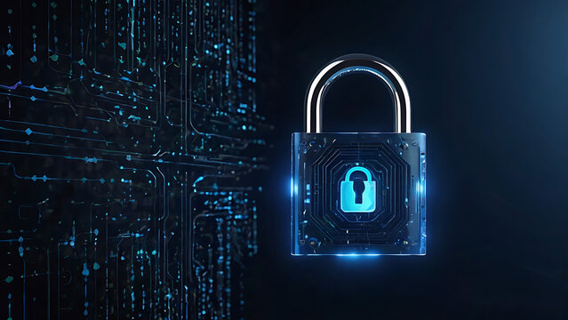 Blue cybersecurity concept with lock symbol representing secure access, data protection, network security, protection against cyber attacks, online fraud prevention, and information technology system