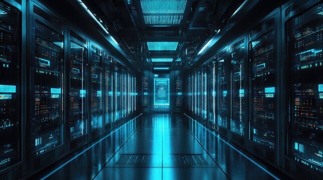 In a high-tech server room, rows of servers glow with LED lights, emphasizing a vibrant tech environment. The facility prioritizes data security and efficient operations