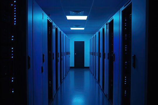 Modern data center with rows of sleek server racks emitting blue lights, showcasing advanced technology and secure infrastructure. Ideal for IT, cloud, and network visuals