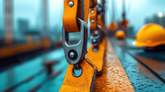 Close-up of industrial safety equipment.  A detailed view of orange straps and metal connectors.  Safety gear and construction work in progress are subtly visible in the background