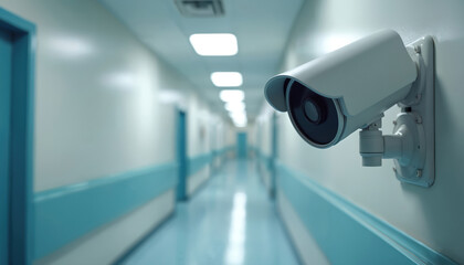 A white dome security camera is mounted on the ceiling of a bright hallway, providing surveillance and safety in a building environment for monito.