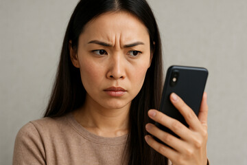 Suspicious Asian woman reacting to phone scam with anger and doubt