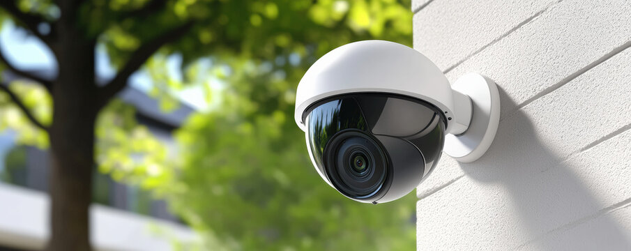A modern security camera is installed on a building's exterior, capturing a view of the surrounding landscaped area with trees and clean lines in an urban environment.