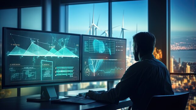 Engineer view a dashboard hud The program shows the total power generated by wind turbines and displays them on the hologram screen. Clean energy technology and renewable energy.