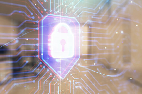 Lock icon drawing with office interior on background. Double exposure. Concept of data security