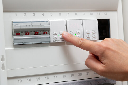 Close up of a hand adjusting voltage level on a voltage relay. Household electricity automation and security  concept
