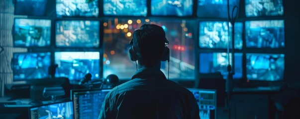 A security operations center using AI to monitor surveillance footage and detect anomalies or threats instantly