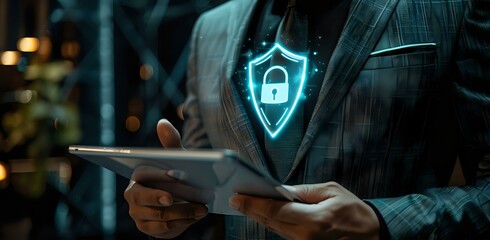 Businessman holding a tablet with a glowing security shield icon, suitable for themes related to technology, security, and business.