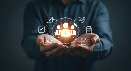 Protection network security computer and safe your data concept, Businessman holding shield protect icon