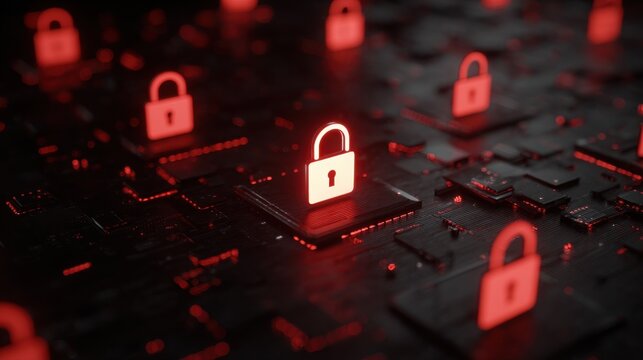 Digital security lock with connecting network lines on red background