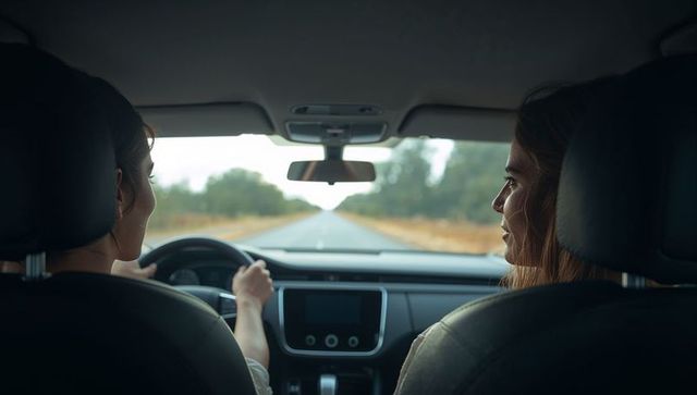 Low-angle driving white sedan heading toward viewer on open asphalt road