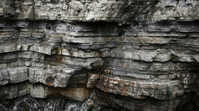 Geological layers show earth history, composition with distinct strata of brown, beige, orange, grey rock formations. Close-up, horizontal cross-section textured sediment, mineral deposits,