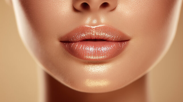 Radiant lips smooth skin golden reflection close up beauty makeup glossy sensual feminine healthy glowing natural soft elegant attractive young woman face cosmetic skincare shine highlight