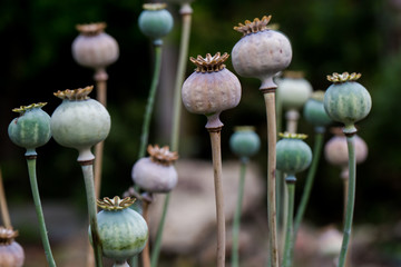 Poppy seed with their heads on wooden boards