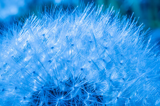 Detailed macro shot of a dandelion seed head illuminated by blue light, creating an abstract and ethereal effect. The intricate network of delicate seeds is highlighted against