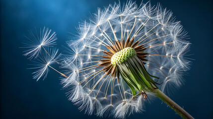 Close-up of a detailed and delicate dandelion seed head with soft blue background.