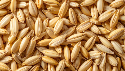 Overhead macro shot of dry whole oat grains with husks and kernels scattered oats cereal
