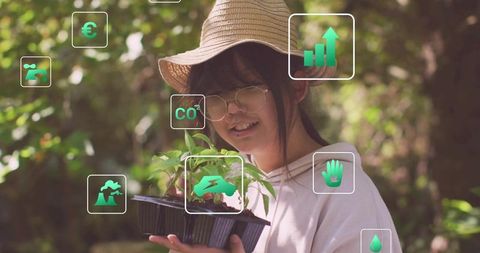 Gardener inspecting seedling at greenhouse bench with data overlay, agtech sustainability