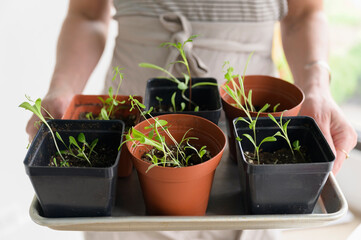 Young seedlings of Alps strawberries in reusable plastic tray. Sprouts of wild Fragaria vesca cultivated  at home from seeds.
