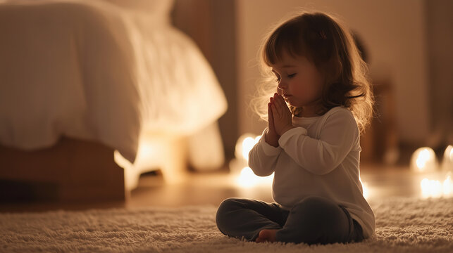 A little toddler girl kneeling on her bedroom floor at night, eyes closed and hands clasped in prayer, seeking protection and forgiveness in a quiet, intimate moment. Photo