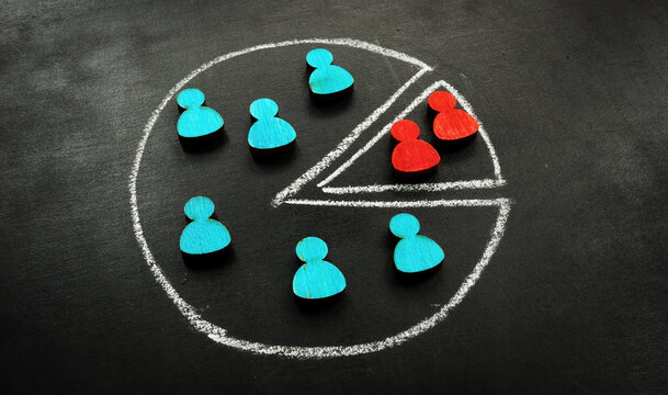 The concept of market segmentation. Target audience, customer care. Market group of buyers. Customer relationship management. Businessman looking through a magnifying glass at figurines of people