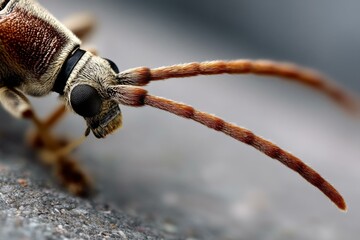 Extreme close-up of a small brown beetle with long, segmented antennae resting on textured surface showing its detailed features.