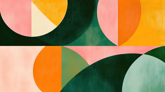 Abstract geometric art with pink, orange, green, and teal circles and segments on a dark background.