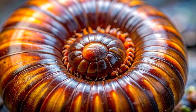 Close-up of a segmented invertebrate curled into a spiral, revealing detailed texture and vibrant colors in natural light