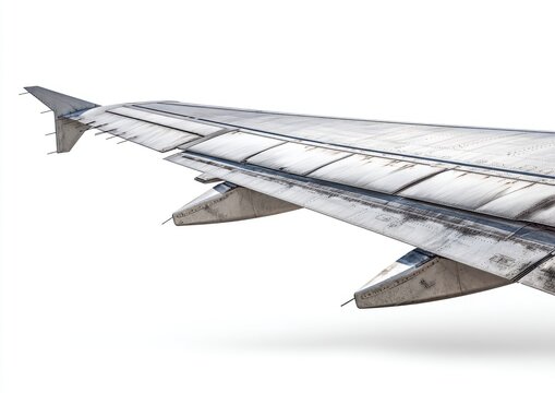 Close-up of an airplane wing, showing the leading edge and flaps.  The wing is slightly aged and shows some discoloration