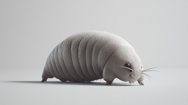 velvet worm glides gently over a pristine white background, its delicate, segmented body and small limbs vividly displayed, highlighting the beauty of this fascinating creature.