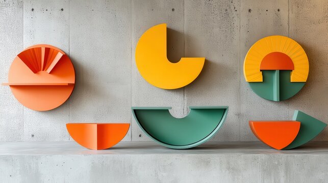 Colorful abstract wall shelves against a textured backdrop.