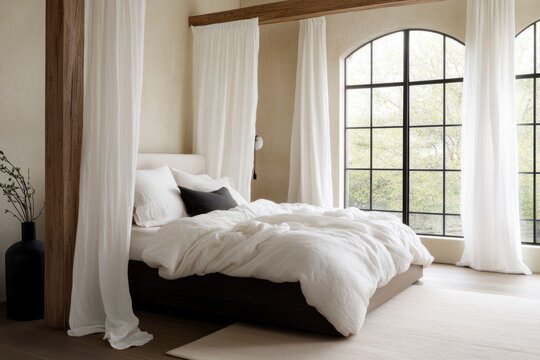 Romantic bed with white flowing fabric panels