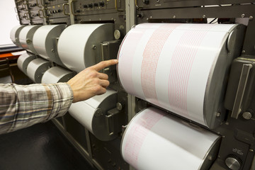 Seismograph recording earthquake human hand