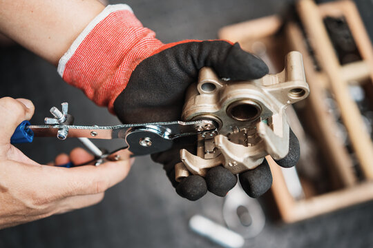 Mechanic remove a seized brake caliper piston with motorcycle caliper piston removal tool in garage, maintenance and repair concept