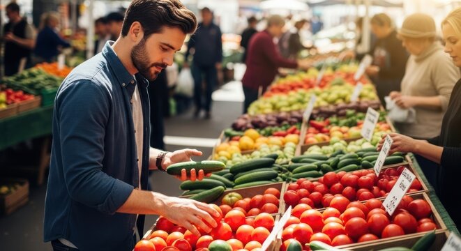 A man shopping at a farmer's market, selecting fresh produce including tomatoes, cucumbers, and other vegetables.