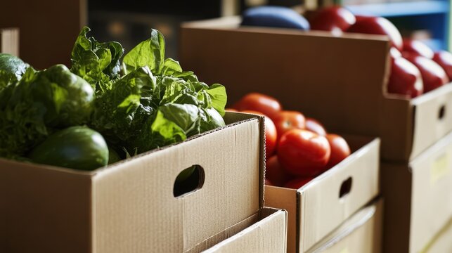 Fresh organic vegetables in cardboard boxes at a health food grocery store showcasing vibrant produce and healthy lifestyle options.