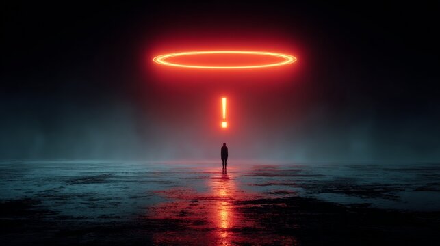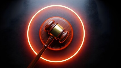 Wooden auctioneer's gavel resting upon a sounding block illuminated by a dramatic glowing orange neon ring symbolizing legal power and final judgment.