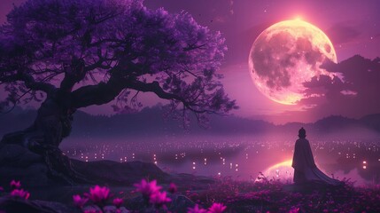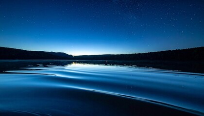 Una ola suave y delicada se mueve sobre la superficie del lago, con suaves reflejos de estrellas y la luna brillando sobre el agua.
