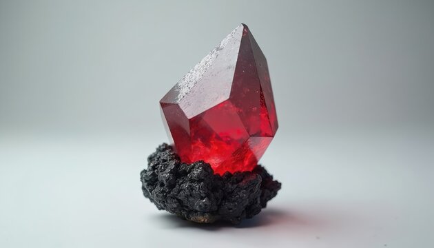 Macro shot of striking red selenium crystal, trigonal shape with smooth facets, sharp edges, metallic luster. Natural mineral specimen on dark, rough matrix. Earth science, geology, education, rare